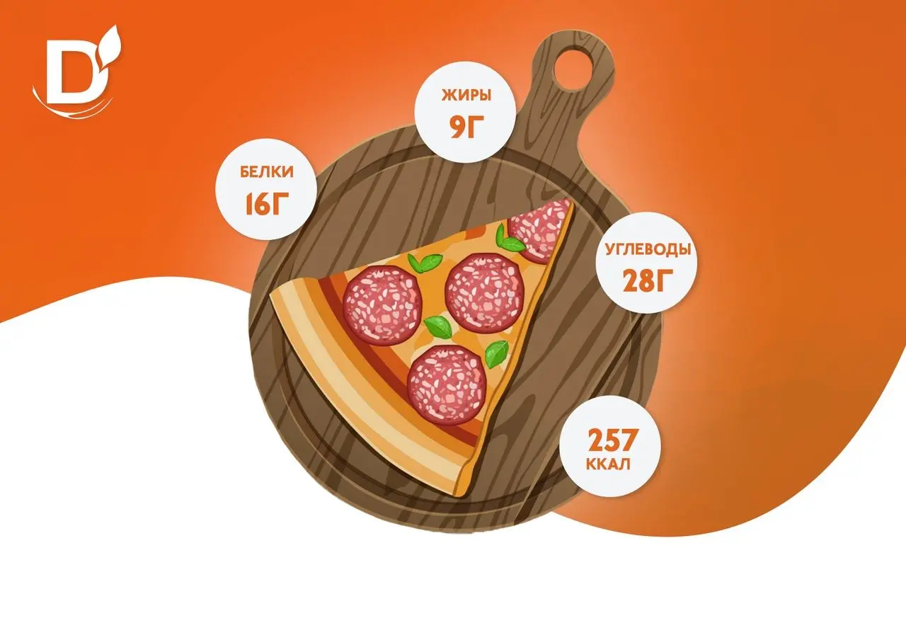 Допустим, вы планируете съесть 200 грамм пиццы пепперони.Смотрим КБЖУ на 100г пиццы на коробке: