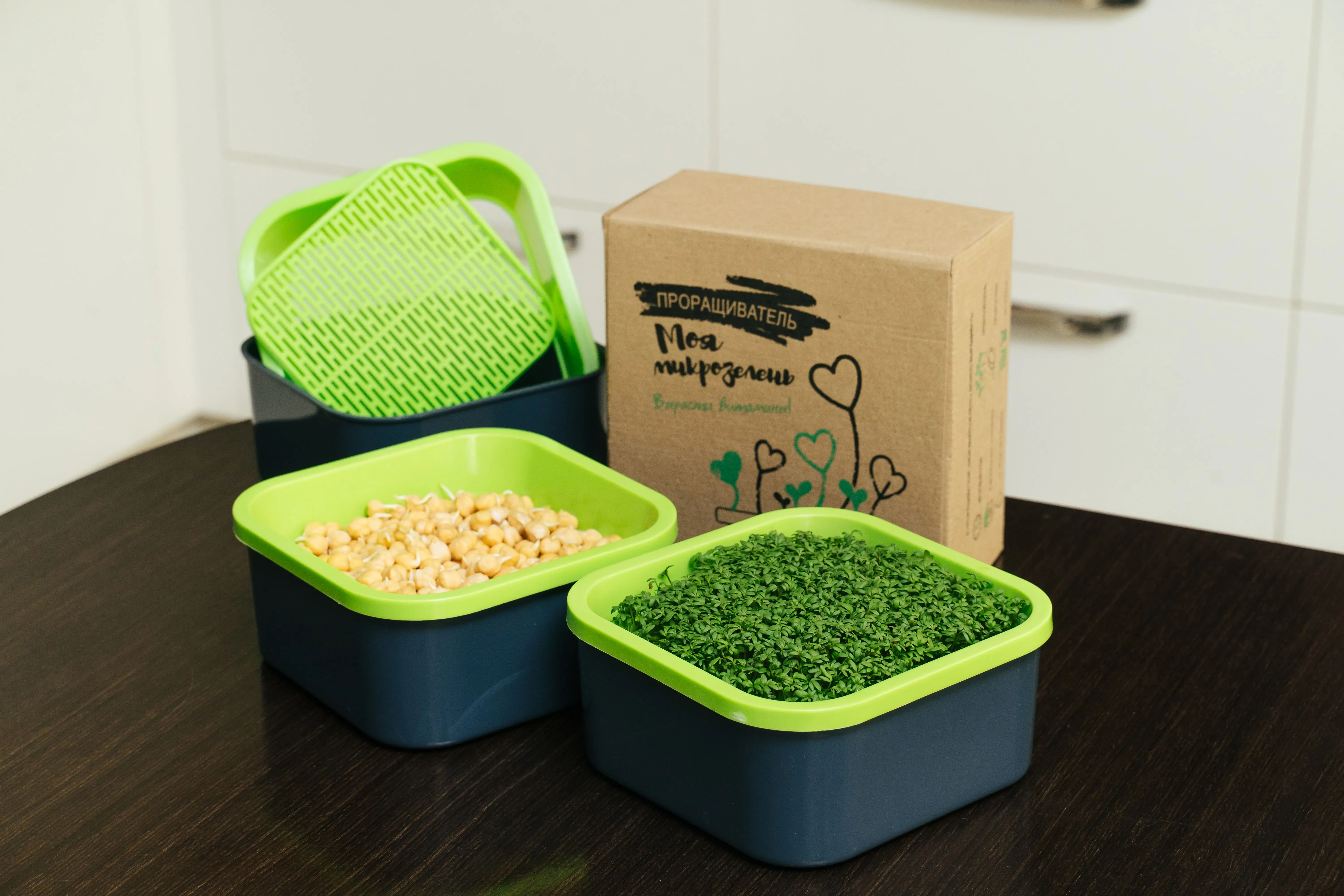 Каждый набор состоит из мини-контейнера с крышкой и подложкой для семян + пакетик с семенами. Это подходящий вариант для тех, кто только планирует заняться проращиванием.Преимущества:
