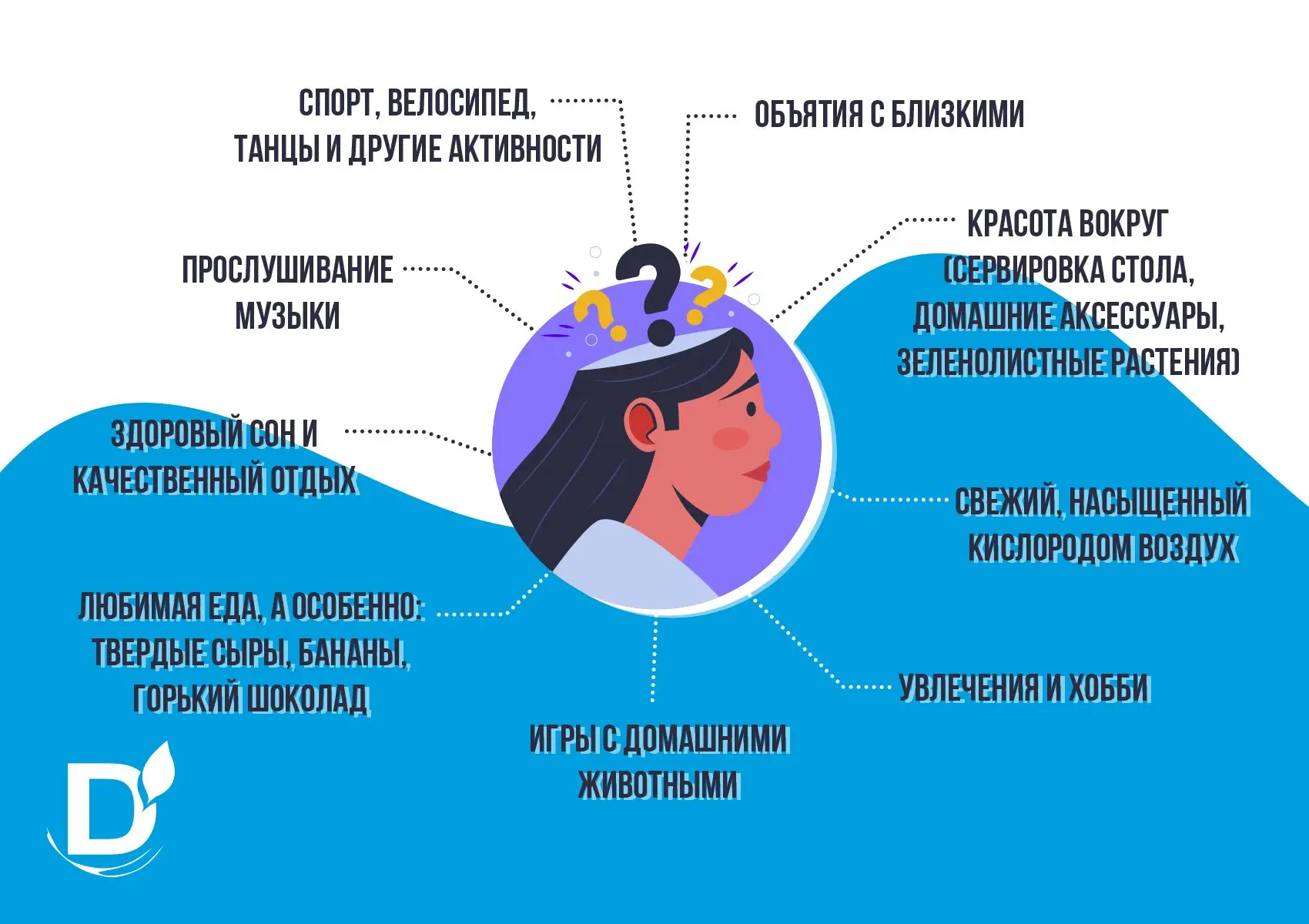Свежий воздух и активность помогут повысить уровень гормонов радости: дофамина и эндорфинов. Они, в свою очередь, подавят действие гормонов стресса. А если еще и витамином Д под солнышком зарядиться, то антистресс эффект гарантирован. Важное условие: активность должна быть в удовольствие. Считается все: прогулки, спортзал, велопокатушки, активные игры, танцы, плавание и тд. Выбирайте то, что по душе именно вам!Если вы не справляетесь со стрессом самостоятельно, а временные тревоги и переживания приобретают хронические формы - пожалуйста, обратитесь к специалисту. Когда болит зуб - мы идем к стоматологу, когда беспокоит слабость - к терапевту. Тогда почему мы упрямо терпим и игнорируем свое душевное состояние и не заботимся о нем так же, как о физическом теле?!