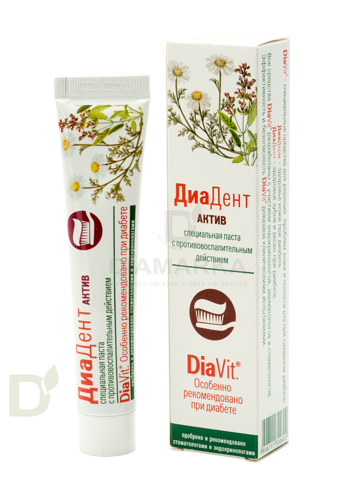 <h2>Ваша полость рта под защитой DiaVit</h2> Продукция ДиаВит нацелена на устранение и профилактику свойственных для диабетиков проблем кожи и полости рта. Кремы ДиаДерм эффективны в борьбе с сухостью, воспалениями, шелушениями, трещинками и опрелостями. Они отлично питают, восстанавливают и увлажняют кожу. В то время как линейка ДиаДент не просто борется с бактериями, живущими в полости рта, но и укрепляет десны, устраняет их кровоточивость, уменьшает проявления ксеростомии и освежает дыхание.<br> <h2>Линейка DiaDent обеспечит здоровье полости рта</h2> Средства с пометкой "Регуляр" идеальны для повседневного ухода за зубами и деснами, а продукты "Актив" рекомендуется в периоды обострений, когда десны воспаляются, болят и кровоточат.<br> <h2>Состав зубной пасты ДиаДент Актив</h2> вода, глицерин, диоксид кремния, полоксамер 188, ПЭГ-600, алюминия лактат, натрия лаурилсульфат, бетаин, гидроксиэтилцеллюлоза, титана диоксид, ароматизатор, натрия бикарбонат, натрия сахарин, альфа-бисаболол, хлоргексидина диглюконат (0,2%), сополимер ВП/ВА, ментол, масло эфирное чайного дерева, масло эфирное эвкалипта, тимол, натрия метилпарабен.<br> <br> <b>Использовать курсами не более 2 недель. С 18 лет.</b>