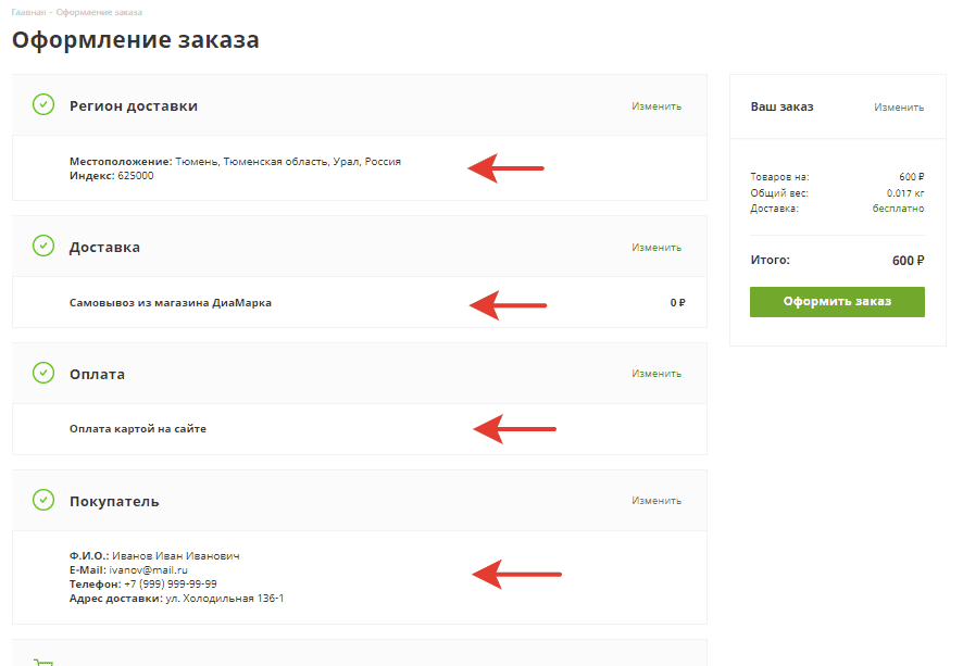 Перед подтверждением заказа проверьте все выбранные и веденные данные, а также товары в вашем заказе: