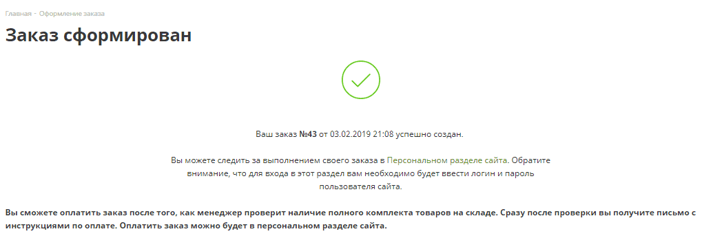 После того вы получите персональный номер заказа и уведомление о том, что ваш заказ сформирован: