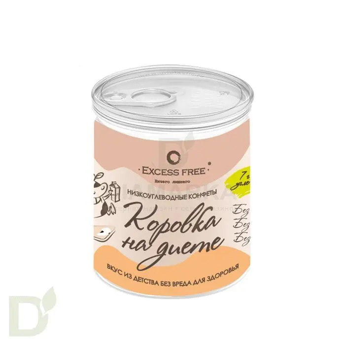 <h3>Конфеты "Коровка на диете" - лакомство для детей и взрослых на диете</h3> <p> <strong>В 1 конфете содержится 0,05ХЕ или 0,55 углеводов. Так что можно их не считать)</strong><br> Вкус любимых сливочных конфет - вкус детства без вреда для фигуры. </p> <h3>А что внутри?</h3> <p> Без жира<br> Продукт обогащен пищевыми волокнами<br> Без синтетических компонентов в составе<br> <br> Состав:  подсластитель натуральный эритритол, пребиотик инулин, изолят сывороточного белка, вода, растительные пищевые волокна, молоко сухое обезжиренное, ксантановая камедь,  пищевой ароматизатор, натуральный консервант низин, сорбат калия,  регулятор кислотности молочная  кислота, экстракт стевии.<br> <br> Вес нетто: 130г<br> <br> Срок хранения: 120 суток при температуре +2 до +10 С<br> 60 суток при температуре +10 до +20 С<br> <br> <br> Энергетическая и пищевая ценность на 100 г:<br> 64,3 ккал<br> <br> 37,7 г пищевые волокна <br> 8,4 г белки<br> 0,19 г жиры<br> 7,3 г углеводы </p>