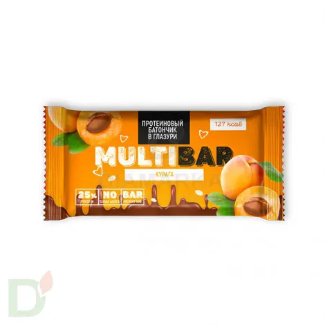<h2>Высокопротеиновые батончики Мультибар без сахара</h2> Мультибар - продукты для правильного и здорового питания из натуральных ингредиентов. БЕЗ сахара, красителей и ГМО. За сладость в протеиновых батонах Мультибар отвечает изомальтоолигосахарид - природный посдластитель, который обладает сладким вкусом, при этом содержит в разы меньше калорий и углеводов, чем сахар.<br> <br> <h3>Преимущества протеиновых батончиков Мультибар</h3> <ul> <li>пониженное содержание углеводов и калорий</li> <li> не вредят зубам</li> <li> очень сытные и питательные, тк на 20% состоят из белка</li> <li> удобно брать с собой</li> </ul> Мультибар - нежный протеиновый батончик, покрытый шоколадной глазурью. Вкусно, сытно и по калориям приятно. Удобно брать с собой, куда бы вы не направлялись!<br> <br> Масса нетто 40 грамм<br> <h3>Состав батончика Мультибар с Курагой</h3> Кондитерская глазурь (подсластитель изомальтоолигосахарид, заменитель какао-масла, какао-порошок, эмульгатор-лецитин соевый Е322, ароматизатор ), кокосовое масло, курага, концентрат молочного белка сухой, концентрат сывороточных белков сухой (изолят), подсластитель изомальтоолигосахарид, ароматизатор пищевой, консервант (сорбат калия). При чрезмерном употреблении может оказывать слабительное действие. Для непосредственного употребления в пищу как продукт с высоким содержанием легкоусвояемых молочных белков и пищевых волокон.<br> <h4>Пищевая и энергетическая ценность на 1 батончик</h4> Белки 10<br> Жиры 3<br> Углеводы 14,9<br> Пищевые волокна 4,4<br> 127 кКал