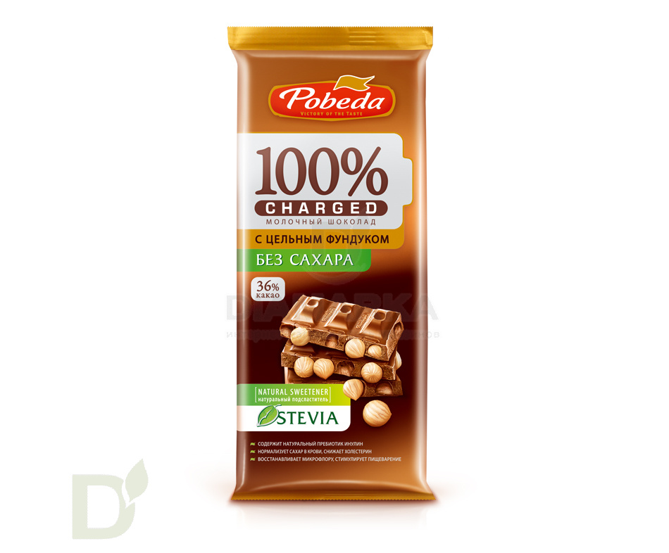 <h2>Настоящий шоколад без сахара на стевии</h2> Если вы хотя бы раз пробовали качественный, НАСТОЯЩИЙ шоколад, то наверняка навсегда запомнили этот яркий, насыщенный вкус?! Найти хороший шоколад в наше время ой как непросто: в большинстве плиток доминирует приторная сладость, а самого какао - кот наплакал.<br> <br> Кондитерская фабрика Победа позаботилась об истинных ценителях шоколада и создала продукт:<br> <ul> <li>в основе которого настоящие какао-продукты</li> <li> в котором нет сахара и лишних углеводов. За умеренную сладость отвечает натуральный подсластитель стевия</li> <li> в котором ДЕЙСТВИТЕЛЬНО МНОГО цельных орехов</li> </ul> <h2>В 100 граммах шоколада Победа ВСЕГО 34 углеводов</h2> Что очень мало, по сравнению с обычными плитками на сахаре!<br> <br> Масса нетто 90 грамм<br> <h2>Состав шоколада</h2> цельный фундук, масло какао, тертое какао, сухое обезжиренное молоко, сыворотка молочная сухая, мальтит, инулин, лецитин соевый, экстракт стевии, натуральная ваниль<br> <h2>Энергетическая и пищевая ценность</h2> б - 14<br> ж - 44<br> у - 34<br> 590 ккал