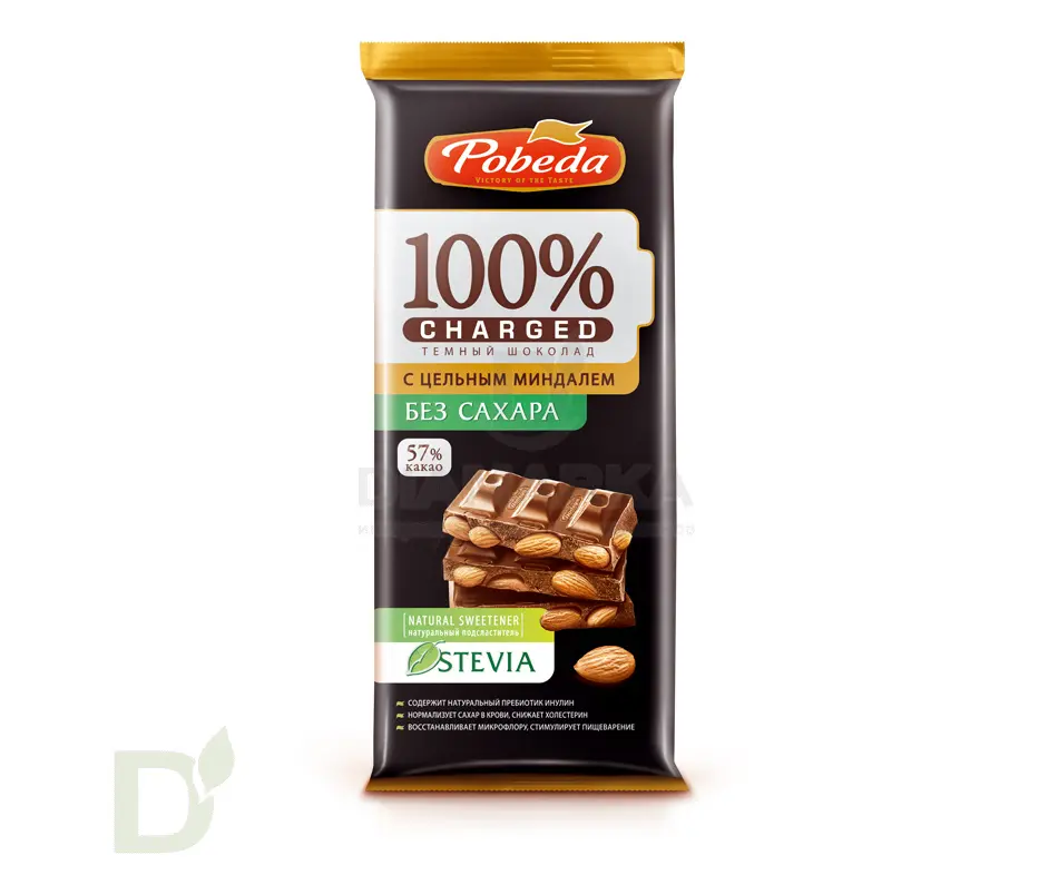 Шоколад Победа Чаржед Темный с миндалем без сахара, 90г.