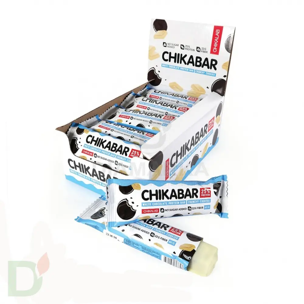 <h2>Bombbar ChikaBar - качественная и полноценная замена перекусу</h2> Непростая задача: выбрать, чем перекусить. Ведь хочется, чтобы было не просто вкусно и питательно, но и полезно...<br> <h2>Каждый батончик на 25% состоит из белка</h2> Протеиновые батончики Bombbar ChikaBar снаружи покрыты вкуснейшей глазурью из белого шоколада, а внутри них спряталась нежнейшая начинка. Достойная замена обычным шоколадкам, конфетам, тортикам и другим сладостям. Высокое содержание белка (25%!) обеспечивает длительное насыщение.<br> <h2>В 1 батончике всего 4,3 грамма углеводов</h2> Они дополнительно обогащены пищевыми волокнами. А это правильная работа желудочно-кишечного тракта + замедление усвоения углеводов. Сплошная польза - с какой стороны не взгляни.<br> <h2>Состав батончика Хрустящее печенье</h2> белковая смесь (концентрат сывороточного белка, концентрат молочного белка), белый шоколад (водорастворимые волокна кукурузы, масло какао, молоко сухое цельное, молоко сухое обезжиренное, эмульгатор (соевый лецитин), ароматизаторы натуральные, подсластитель (сукралоза)), паста белая молочная с кешью (кешью, водорастворимые волокна кукурузы, изолят сывороточного белка, кокосовое масло, молоко сухое обезжиренное, эмульгатор (соевый лецитин), ароматизаторы натуральные, антиокислитель (аскорбиновая кислота), подсластитель (сукралоза)), водорастворимые волокна кукурузы, инулин (пищевые волокна), олигофруктоза (пищевые волокна), клубника, масло кокосовое, вода, агенты влагоудерживающие (глицерин, сорбит), какао-порошок, рисовые шарики (рисовая мука, кукурузная крупа, соль), соль, ароматизаторы натуральные, регулятор кислотности (лимонная кислота), эмульгатор (соевый лецитин), краситель натуральный (чёрный (растительный кокосовый уголь)), антиокислитель (аскорбиновая кислота), консервант (сорбат калия), натуральный подсластитель (стевиозид).<br> <br> <b>Может содержать незначительное количество фундука.</b><br> <h2>КБЖУ на 1 батончик</h2> б - 15, ж - 12, у - 4,3<br> клетчатка - 22 грамма<br> 227 ккал<br> <br> Вес батончика - 60 грамм.