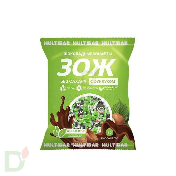 <h2>Шоколадные конфеты без сахара для правильного питания</h2> Мультибар - продукты для правильного и здорового питания из натуральных ингредиентов. БЕЗ сахара, красителей и ГМО. За сладость во вкусняшках Мультибар отвечает аллюлоза - природный полисахарид, который обладает сладким вкусом, при этом не усваивается ЖКТ, следовательно: его потребление не приводит к повышению уровня сахара крови.<br> <br> <h3>Преимущества подсластителя аллюлоза</h3> <ul> <li>низкое содержание углеводов и калорий</li> <li>без неприятного привкуса</li> <li>не влияет на ЖКТ, не вызывает слабительного эффекта</li> <li>не вредит зубам</li> </ul> Масса нетто 150 грамм<br> Срок годности - 9 месяцев<br> <h3>Состав конфет без сахара ЗОЖ Шоколад-Фундук</h3> Какао масло, молоко сухое цельное, подсластитель натуральный аллюлоза (аллюлоза, вода), какао тертое, обезвоженный молочный жир, фундук, эмульгатор (лецитин подсолнечный), ароматизатор натуральный. Молочный шоколад содержит общий сухой остаток какао не менее 33%, сухой обезжиренный остаток какао не менее 5%, сухой молочный остаток не менее 26%, молочный жир не менее 4%. <br> <h4>Калорийность конфет без сахара Мультибар</h4> б - 11,5г<br> ж - 39г<br> у - 15,2г<br> 458 ккал<br>